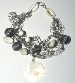 Halskette MOONHalsnahe Kette; Länge ca.45cm (dehnbar)Perlen: Keramik-Textil-weisse Koralle-Muschel und abnehmbarer MuschelblattanhängerGrundmaterial: Metalldraht; Hakenverschluss