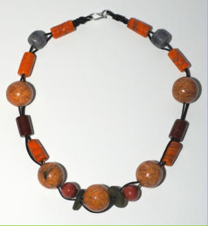 Halskette TANSANIA(verkauft)kurze Kette; Länge ca. 55cmPerlen: Keramik-Glas- PapierGrundmaterial: Lederband; Hakenverschluss