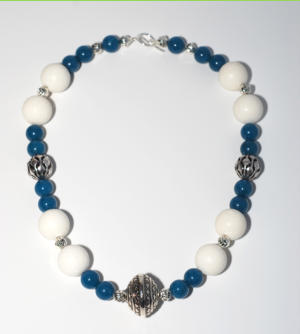 Halskette SUMMERkurze Kette; Länge 62 cm Perlen: weisse Koralle-gefärbter Jaspis (Halbedelstein)-MetallGrundmaterial: Metalldraht; Knebelverschluss